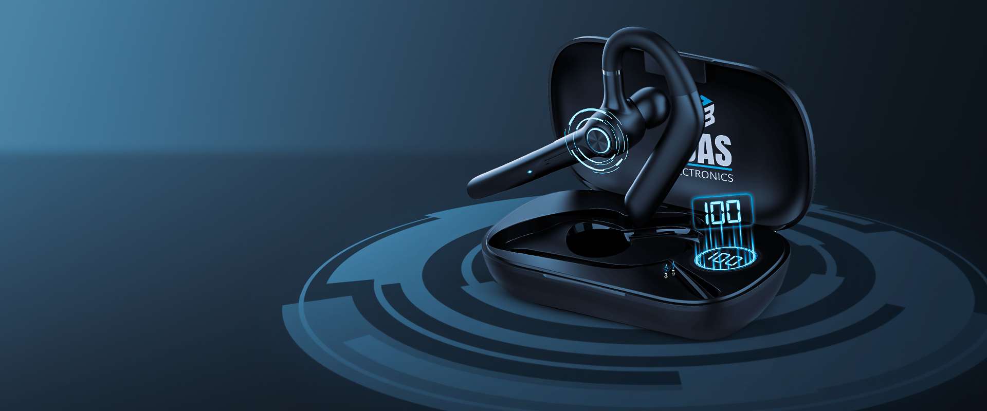 A high-quality wireless headset with 12-hour battery durability that ensures a deep and powerful sound experience. Professional Bluetooth headset features include two built-in HD omnidirectional microphones, a 400mAh charging case, and USB C charging cable. Easily connect the headset to mobile and laptop devices and enjoy clear phone calls and music from any location.Â
